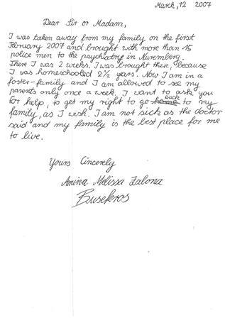 More than six weeks ago she was taken “with more than 15 police men” from her home to a psychiatric hospital in Nuremberg, she wrote, and about a month she was placed in a foster home.